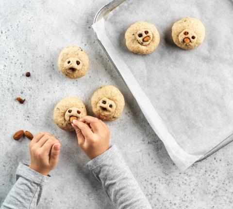 Dimezzare gli acini di uva sultanina. Dimezzare l'impasto. Da una metà ricavare 5 palline. Con le forbici incidere le palline per formare le orecchie dei coniglietti. Con uno spiedino in legno praticare su ogni pallina 2 fori e inserirvi un acino di uva sultanina dimezzato per ricavare gli occhi. Dall'altra metà staccare un po' di pasta e formare 5 palline per realizzare le codine, quindi attaccarle al coniglietto con un po' d'acqua.