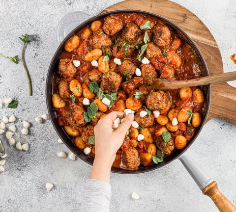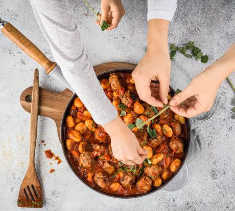 Nella stessa padella scaldare l’olio e soffriggervi uno spicchio d'aglio spremuto. Aggiungere i pomodori e il prezzemolo messo da parte, condire e lasciar sobbollire per 10 min. mescolando di tanto in tanto. Staccare le foglioline dell'origano, unire alla salsa insieme alle polpette e agli gnocchi, quindi mescolare.