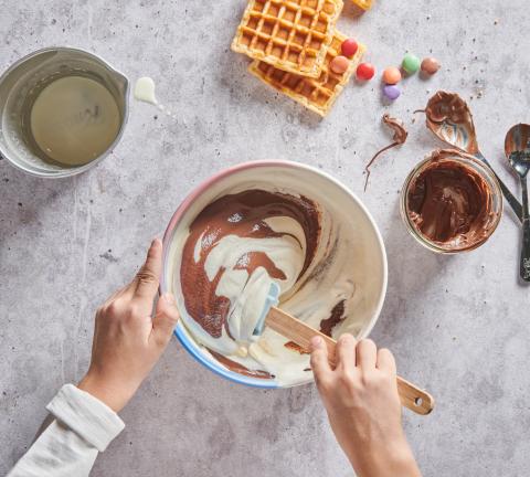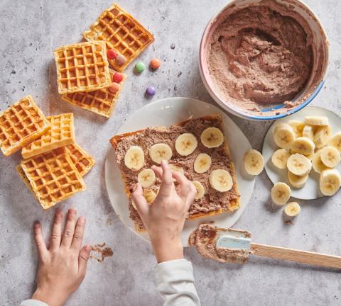 Tagliare le banane a rondelle di ca. 1 cm di spessore. Mettere 2 gaufre su un vassoio. Distribuirvi sopra ¼ di panna al cioccolato e ¼ delle fette di banana, ripetere l'operazione fino a esaurimento delle gaufre. Guarnire con la panna e le banane restanti e mettere in frigo per almeno 1 ora.