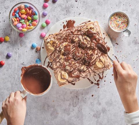 Sciogliere la glassa per torte e versarla sulla torta di gaufre. Decorare con smarties e perline di zucchero.