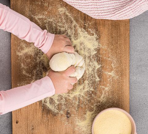 Unire l’acqua e l’olio, mescolare con una spatola tarocco e lavorare il tutto per ca. 10 min. fino a ottenere un impasto morbido e liscio. Coprire e lasciar lievitare a temperatura ambiente per ca. 2 ore finché il volume sarà raddoppiato.