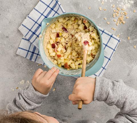 Mescolare la farina, le nocciole, i fiocchi d'avena e il lievito in polvere, quindi incorporare alla crema. Tagliare le mele a dadini e metterne da parte 3 cucchiai. Incorporare all'impasto i dadini di mela e il succo di limone.