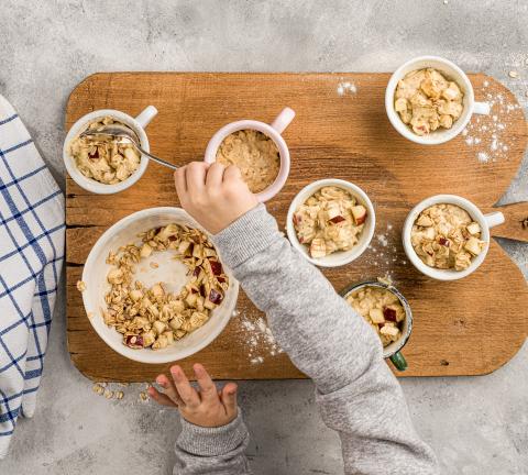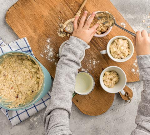Imburrare e infarinare le tazze. Riempire le tazze con l'impasto.