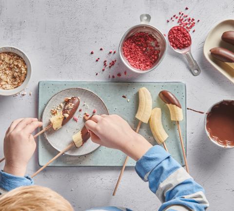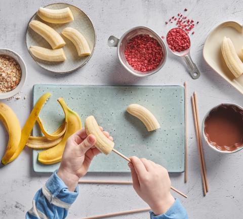 Sbucciare le banane, dimezzarle e infilare un stecco di legno in ognuna delle metà.