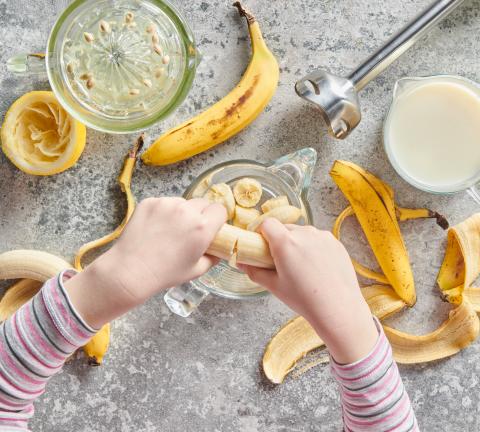 Sbucciare le banane e spezzettarle, quindi trasferirle in un misurino graduato. Unire il latticello, il gelato, i cubetti di ghiaccio e il succo di limone, quindi frullare.