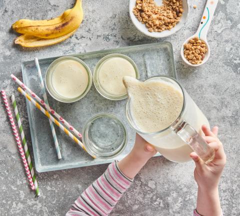 Versare il frappè nei bicchieri e guarnire con la granola.