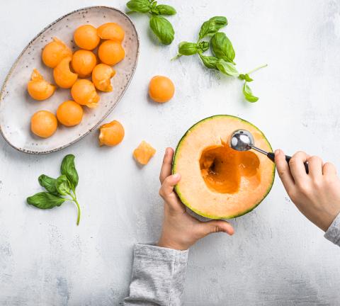 Con uno scavino ricavare alcune palline di melone. Infilzare negli spiedini di legno i pomodori, la mozzarella e le foglioline di basilico alternandoli con le palline di melone.