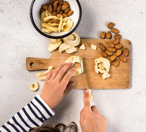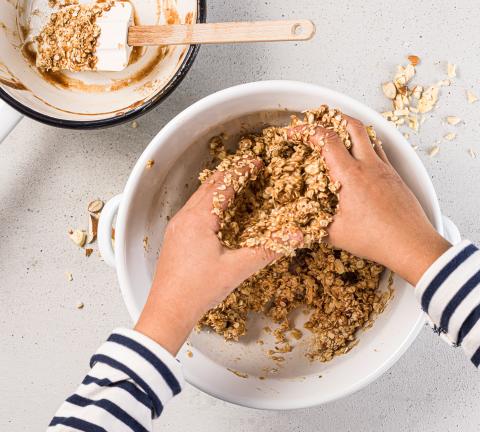 Unire i fiocchi d'avena, la cannella e il sale. Aggiungere il composto a base di crema di mandorle e lavorare a mano fino a ottenere un impasto compatto.