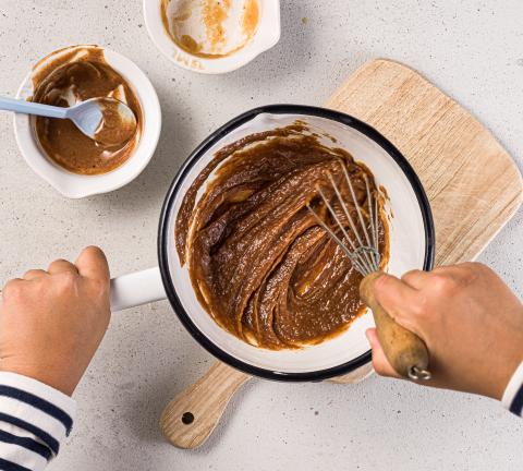 Mescolare la crema di mandorle, la composta di mele e il miele.
