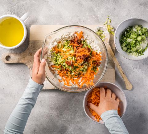 Tagliare i cipollotti ad anelli sottili. Pelare la carota e grattugiarla insieme alla zucchina con la grattugia per rösti. Sgocciolare bene i pomodori e tritarli finemente. Aggiungere la verdura, l'acqua e l'olio alla farina e mescolare, lavorare fino a ottenere un impasto morbido e liscio. Coprire e lasciar lievitare a temperatura ambiente per ca. 2 ore.