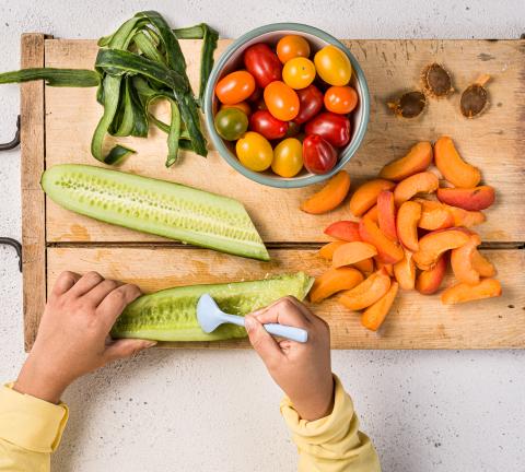 Pelare il cetriolo, dimezzarlo e togliere i semi con un cucchiaio. Tagliarlo a fettine. Dividere in quarti i pomodori cherry e le albicocche.