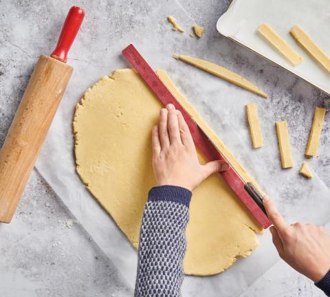 Stendere la pasta tra le superfici di un sacchetto per congelatore tagliato lungo due lati formando un rettangolo spesso ca. 7 mm, quindi coprirlo e rimetterlo in frigo per 30 min. circa. Tagliare la pasta a bastoncini (ca. 1 cm x 8 cm) e disporli su due placche rivestite con carta da forno.
