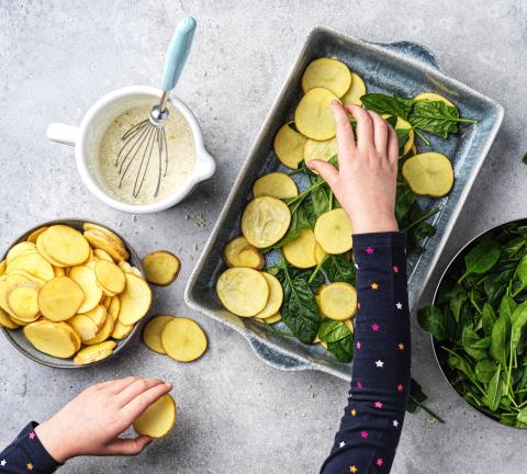 Tagliare le patate a fette spesse ca. 3 mm. Mettere le fette di patate nella pirofila alternandole agli spinaci. Versarvi sopra la salsa.