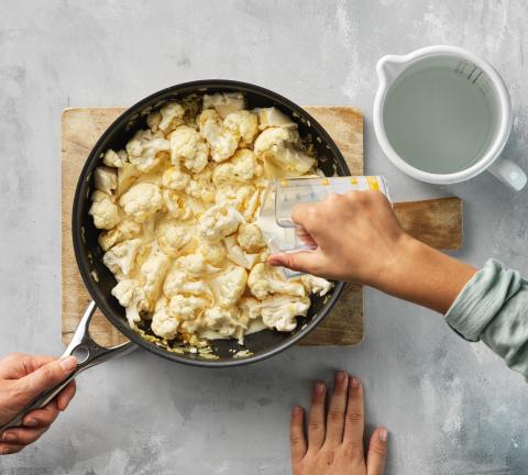 In un pentolino scaldare l'olio. Unire la cipolla e l'aglio e rosolarli brevemente. Aggiungere il cavolfiore rimasto e continuare a rosolare brevemente. Unire l’acqua e la panna, salare, coprire e lasciar sobbollire per ca. 20 min., frullare finemente. Aggiungere il parmigiano.