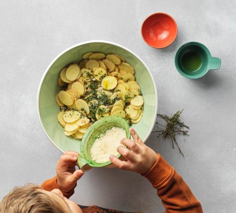 Tagliare le patate a fettine spesse ca. 2 mm e sistemarle in una ciotola. Aggiungere l'olio e il sale, spezzettare le foglioline di timo e aggiungerle, quindi unire il formaggio e mescolare il tutto.