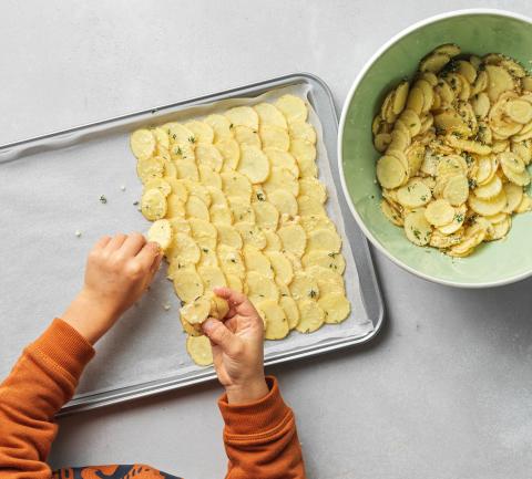 Disporre le fettine di patata leggermente sovrapposte una sull’altra su due placche rivestite con carta da forno.