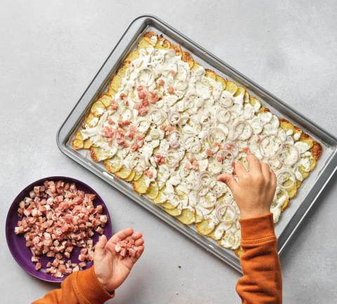 Sbucciare gli scalogni e tagliarli ad anelli sottili. Distribuire metà della crème fraîche sulle fette di patate, quindi guarnire con la metà della pancetta a dadini e degli scalogni, spezzettare le foglie di timo e distribuirle sulle patate.