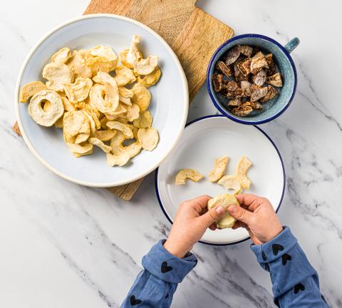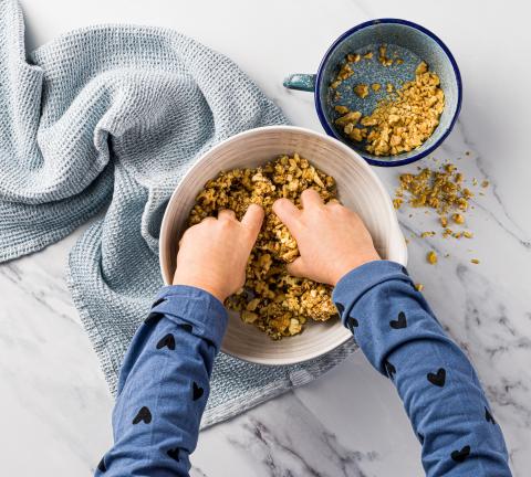 Mettere i fiocchi d'avena in un cutter e tritarli. In una ciotola mescolare i pezzettoni di mele, i fichi, il miele, la cannella e il sale.Tritare il tutto poco per volta con i fiocchi d'avena nel cutter continuando fino a ottenere un composto malleabile. Rimettere il composto nella ciotola. Tritare grossolanamente i gherigli di noci, unirli al composto e impastarli al resto.
