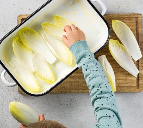 Ungere una pirofila da ca. 2 litri con il burro. Staccare le foglie della cicoria, sistemarne ca. 12 nella pirofila una accanto all'altra, scegliendo le più grandi. Tagliare il resto della cicoria a striscioline sottili e metterla da parte.