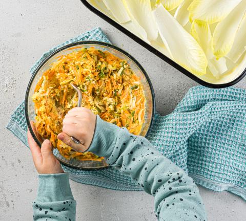 Tagliare i cipollotti ad anelli sottili. Grattugiare grossolanamente le carote con la grattugia per rösti. In un pentolino scaldare l'olio. Unire i cipollotti e farli appassire per ca. 5 minuti. Aggiungere le carote e le striscioline di cicoria belga messe da parte, quindi lasciar insaporire brevemente. Unire l'acqua e portare a bollore. In una ciotola mettere il couscous, il curry e il sale, quindi mescolare. Unire il liquido di cottura delle carote, coprire e lasciar gonfiare per circa 5 minuti. Sgranare il couscous con una forchetta.