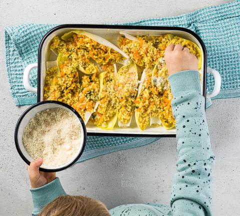 Farcire le foglie di cicoria belga con il couscous, mescolare il formaggio con il pangrattato e distribuirlo sulle foglie di cicoria. Guarnire con fiocchi di burro. Coprire la pirofila con la carta d'alluminio.