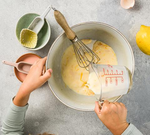 In una ciotola mescolare la farina, il sale, lo zucchero e il lievito in polvere. Grattugiare un po' della scorza del limone e unirla. Mescolare il latte con le uova, unirli e amalgamare il tutto fino a ottenere una pastella liscia.